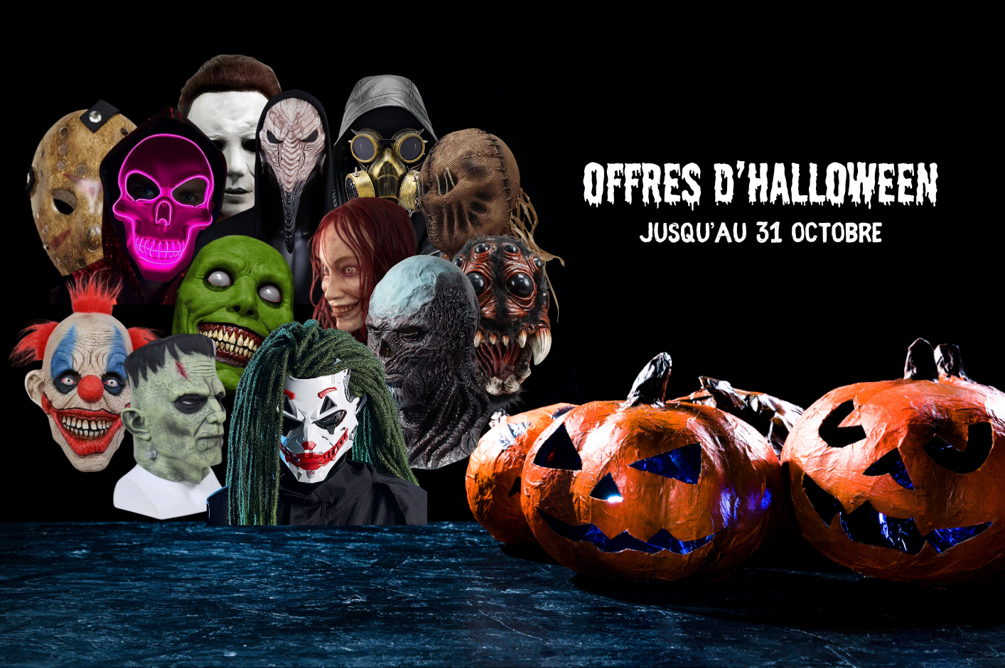 Découvre notre collection terrifiante de masques et accessoires. Profite de prix ensorcelants avant que la fête ne disparaisse dans la nuit…